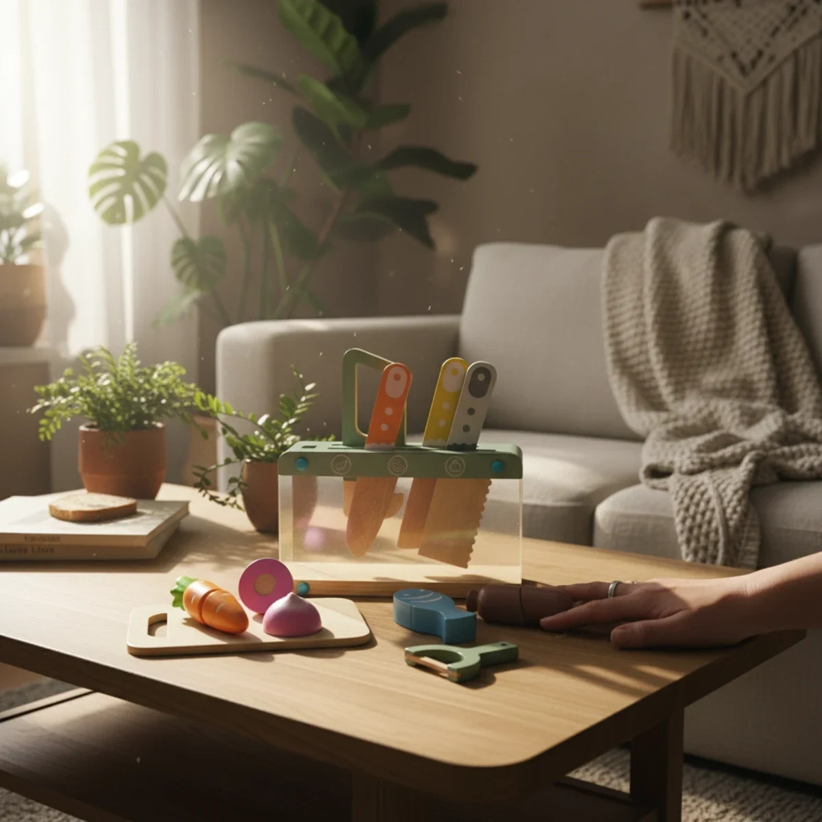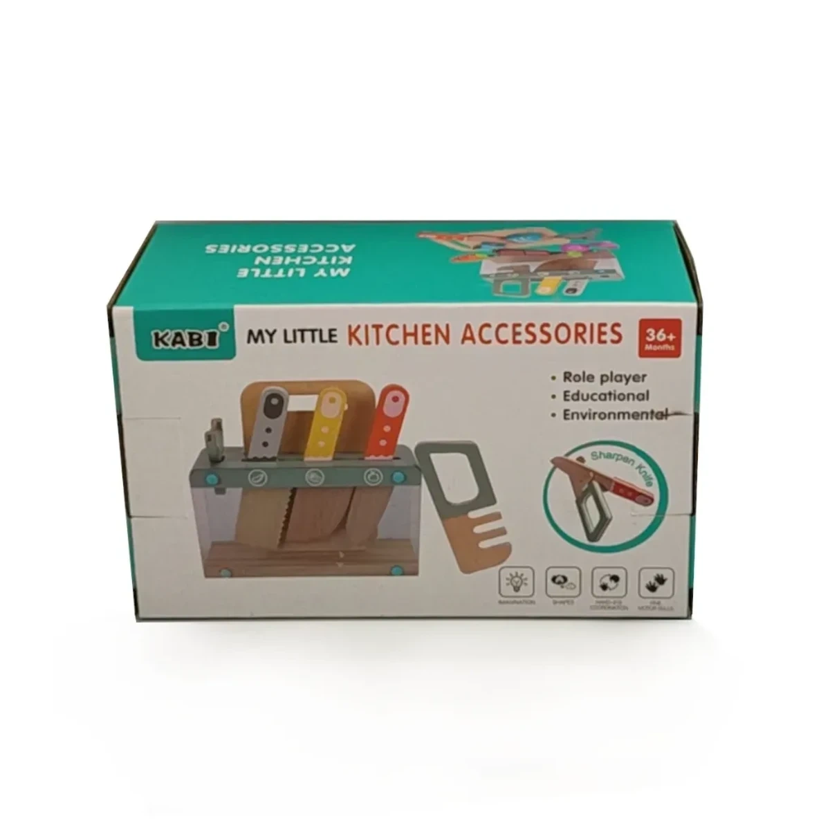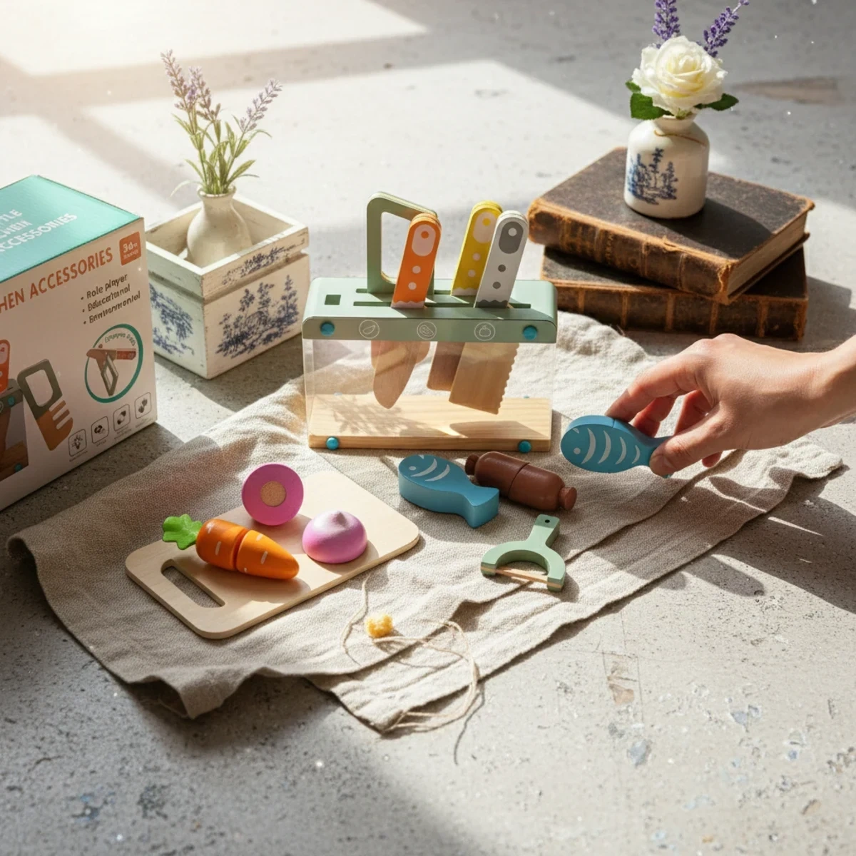 Zestaw Kabi My Little Kitchen to perfekcyjne narzędzie do zabawy w małego kucharza. Twój przedszkolak odkrywa świat gotowania dzięki 12 drewnianym akcesoriom w stonowanych, pastelowych barwach. Centralnym elementem jest unikalny stojak na noże z przezroczystymi ściankami z akrylu – dziecko widzi, gdzie znajdują się poszczególne narzędzia, co uczy organizacji przestrzeni.