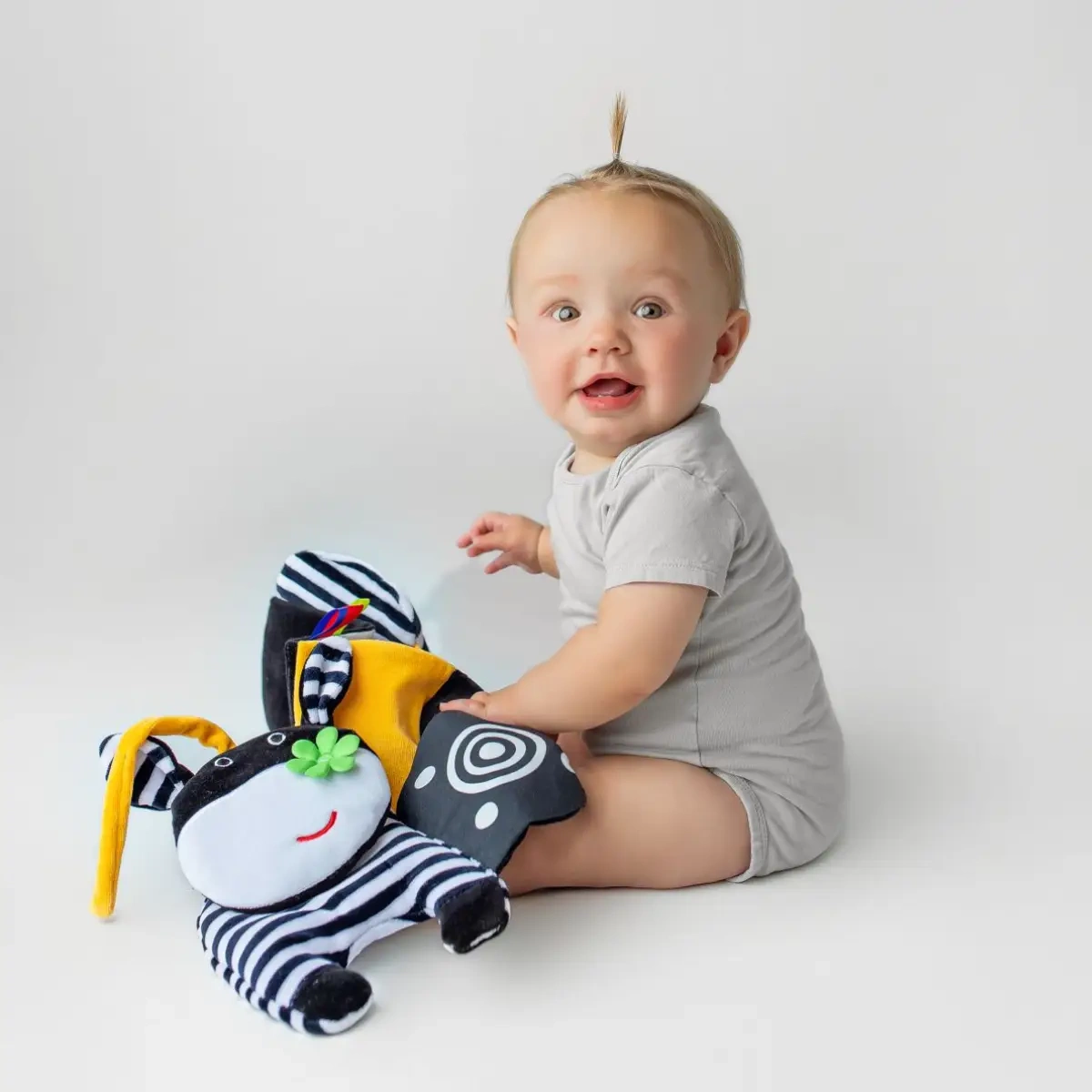 Pierwsze miesiące życia dziecka to kluczowy okres dla rozwoju wszystkich zmysłów. Książeczka Króweczka została zaprojektowana, by dostarczać zróżnicowanych bodźców, które stymulują wzrok, słuch i dotyk malucha. Kontrastowe, biało-czarne ilustracje przykuwają uwagę niemowląt, których wzrok dopiero się rozwija. Szeleszczące elementy delikatnie pobudzają zmysł słuchu, a różnorodne faktury (mięciutka bawełna frotte i przyjemny w dotyku minky) dostarczają bogatych doznań dotykowych. Te wielozmysłowe doświadczenia wspierają integrację sensoryczną - proces, który pozwala dziecku prawidłowo odbierać i interpretować bodźce płynące z otoczenia.
