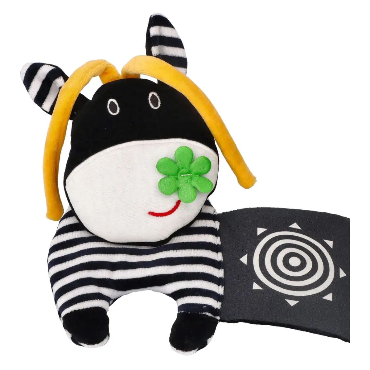 W pierwszych miesiącach życia książeczkę Króweczka najlepiej zamocować na brzegu łóżeczka lub przewijaku. Kontrastowe wzory będą stymulować wzrok dziecka, a szeleszczące elementy zachęcą do nasłuchiwania. To idealny moment, by maluch obserwował książeczkę podczas leżenia na plecach lub podczas przewijania, kiedy potrzebuje pozytywnego rozproszenia uwagi.