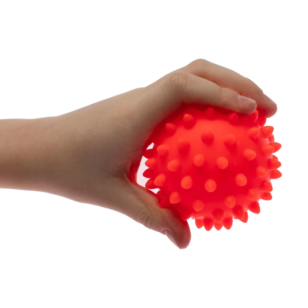 - Czerwona piłeczka z delikatnymi wypustkami stymuluje zmysł dotyku Twojej pociechy od 6 miesiąca życia. Miękki materiał doskonali chwyt, usprawnia motorykę małą i koi napięte mięśnie. Znakomite narzędzie do masażu i kreatywnej zabawy niemowląt.
