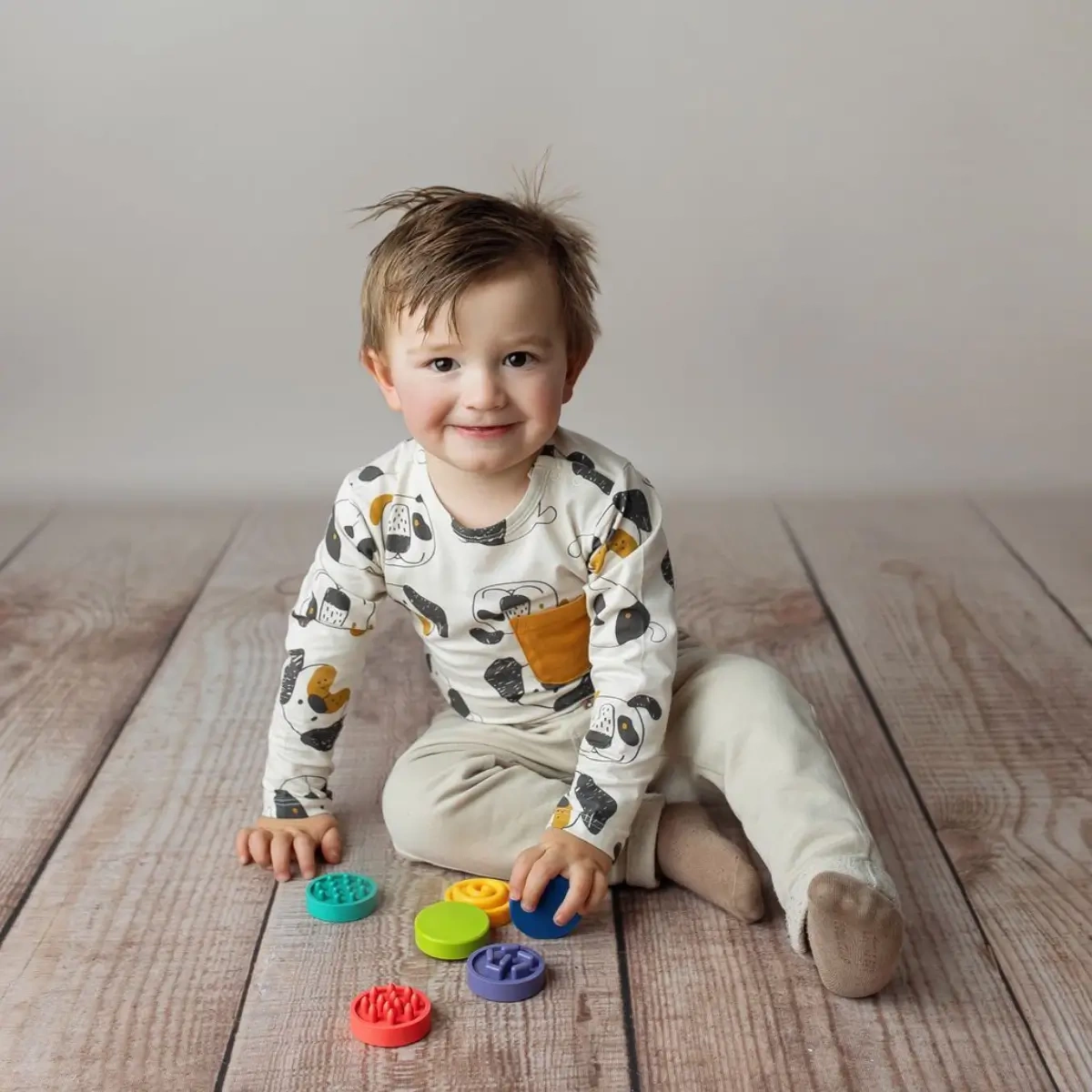 Szukasz zabawy, która wciągnie malucha i wesprze jego rozwój? Te puzzle sensoryczne to 6 dużych, kontrastowych kółeczek, które Twoje dziecko dopasowuje do wycięć na miękkiej desce. Każde kółko ma inną fakturę – dzięki temu niemowlę poznaje świat poprzez dotyk. Producent Mom's Care zaprojektował zestaw z myślą o wszechstronnym rozwoju maluchów od 6 miesięcy.