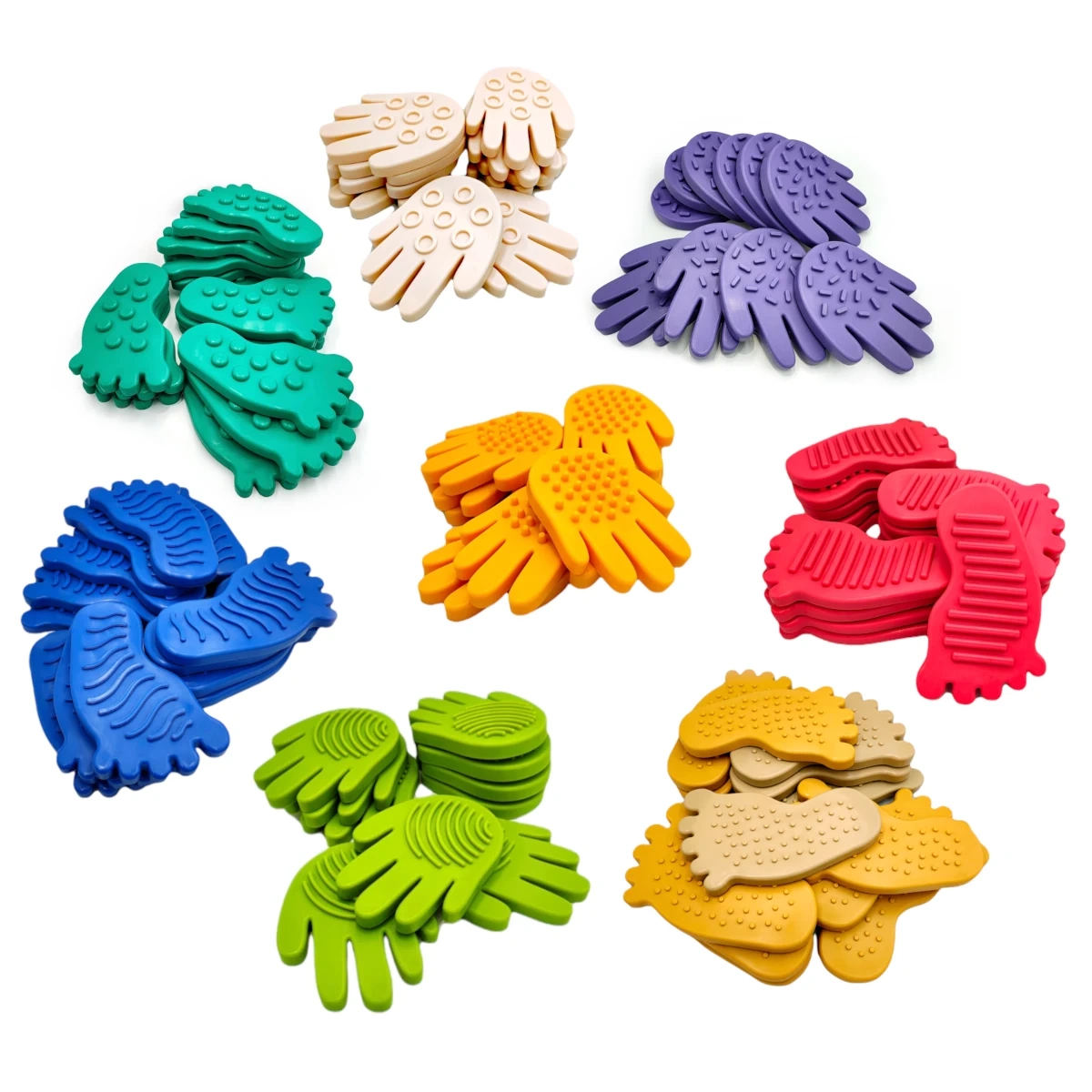 Co zawiera zestaw? 100 elementów sensorycznych w kilku wariantach kolorystycznych i fakturowych.