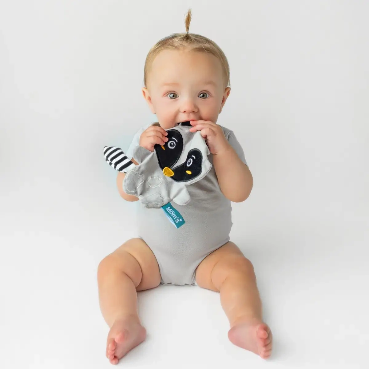 Szeleścik Szop Pedro to wielozmysłowa przytulanka marki Mom's Care, zaprojektowana dla najmłodszych odkrywców. Mięciutki welurek, kontrastowy ogonek i kolorowa metka tworzą znakomitą kompozycję bodźców. Twoja pociecha z zaciekawieniem bada każdą fakturę i dźwięk.