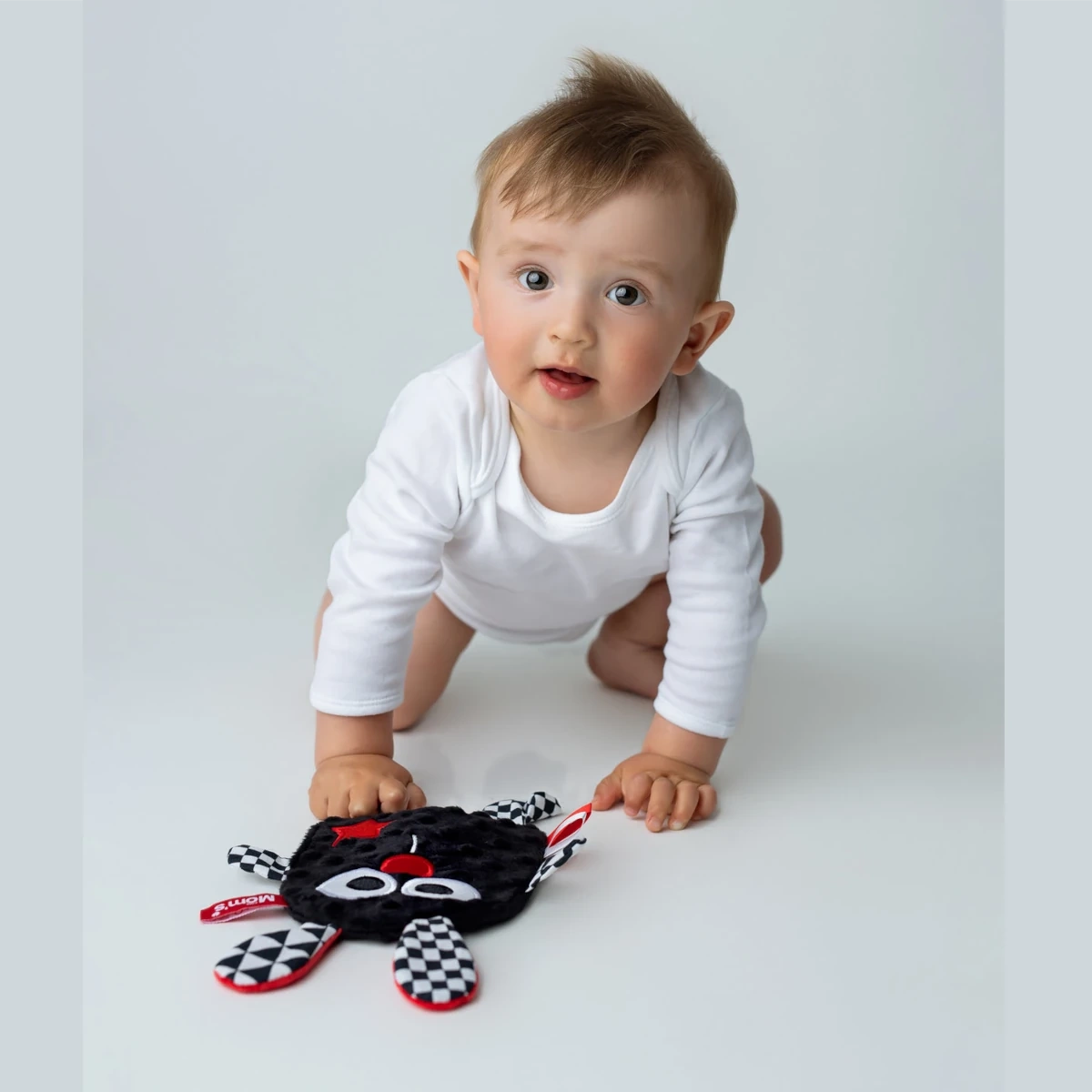 - Kontrastowa zabawka sensoryczna od 0 lat, która łączy szeleszczącą folię, miękką tkaninę Minky oraz kolorowe metki w jednej gwiazdce. Czarno-biało-czerwone elementy stymulują wzrok, a szelest wycisza i ciekawi badawcze paluszki niemowlaka.
